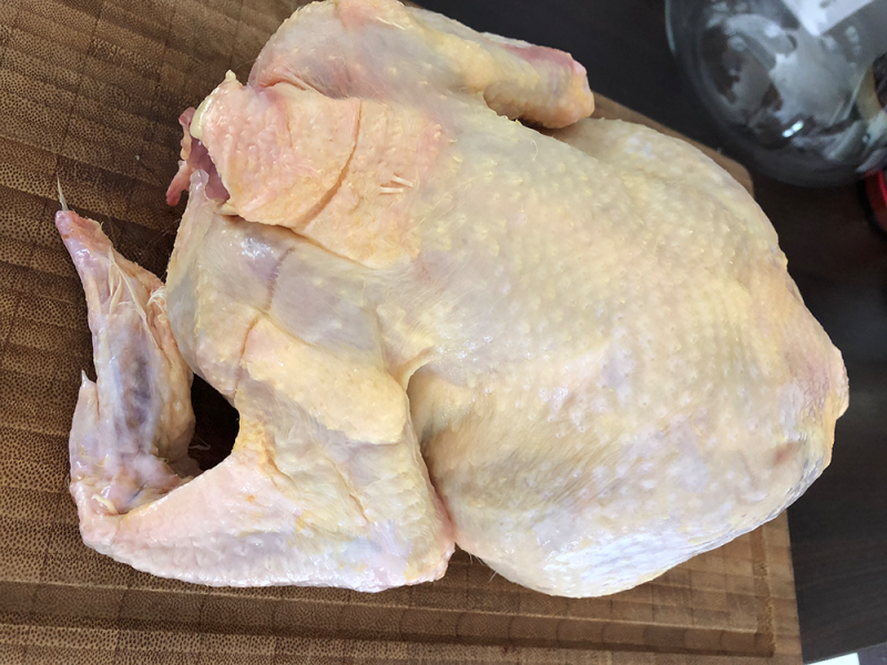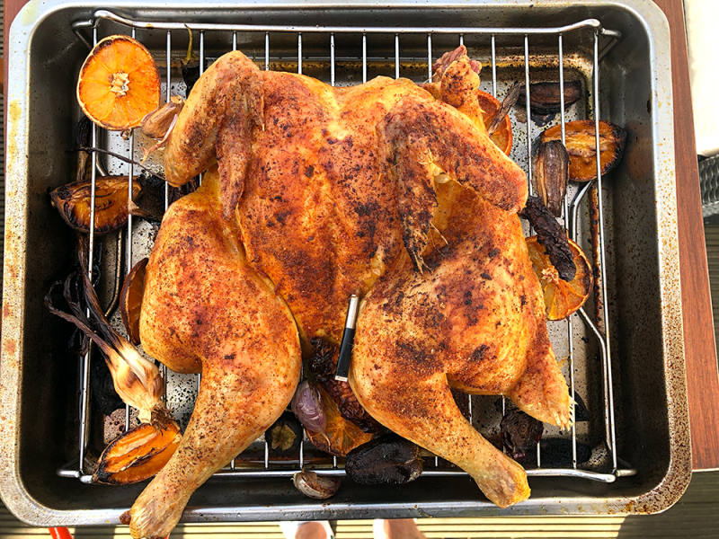 Das Roadkill Chicken oder Platthuhn wird im ganzen „platt“ gegart. Man trennt das Rückgrat idealerweise mit einer Geflügelschere heraus und drückt etwas auf den Brustkorb, somit wird es sehr flach (wie vom Auto überfahren 🙁 ). Der Vorteil ist, dass es deswegen schneller gart und ich finde auch saftiger wird. Jetzt kann man das Hähnchen ideal würzen und es kann auf der IKEA Koncis Ofenform mit Rost platz nehmen.