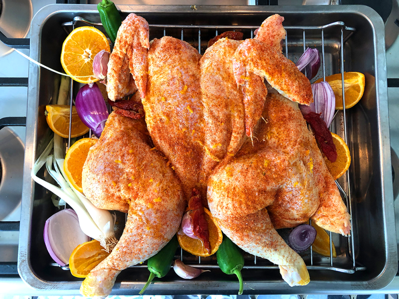 Die Orangenschale raspeln und auf dem Hähnchen verteilen. Die Orange in Scheiben schneiden und um das Hähnchen legen. Die Knoblauchzehen andrücken und mit halbierter Frühlingszwiebeln unter und um das Kikok-Hähnchen legen. Die rote Zwiebel in große Stücken schneiden und verteilen.