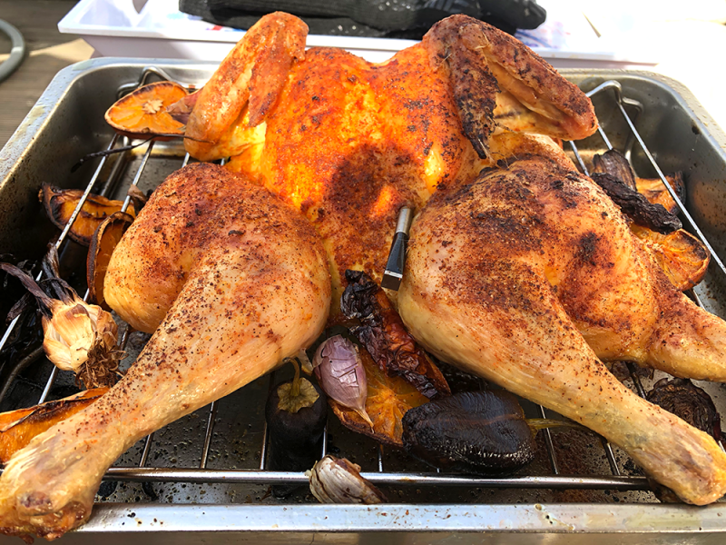 Sobald der Gasgrill auf ca. 180°C eingeregelt ist, platziere ich die Ofenform so, dass daneben noch eine Räucherbox über einen Brenner liegen kann. Ich habe hier ein paar Kirsch-Chips von BolleBolle räuchern lassen. Nachdem eine Kerntemperatur von ca. 80 Grad erreicht ist, ist das Kikok-Hähnchen fertig! Etwas ruhen lassen und genießen. Die Garzeit beträgt ca. 90 Minuten.