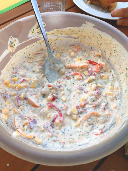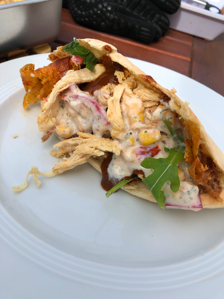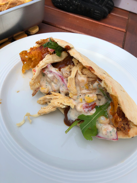 Die Zutaten vermengen und ziehen lassen. Die Pita mit etwas BBQ-Sauce bestreichen und mit der Joghurt-Mischung befüllen. Rucola und Hähnchenfleisch dazu und wieder etwas von der Joghurt-Mischung oben drauf. Schmeckt super und man ist nach dem Grillnachmittag nicht völlig geplättet 😉 .